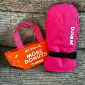 Brighten your day with this tote bag. Featuring lively pink and orange colors, it's perfect for carrying small treasures. Ideal for young donut fans! Then proudly wear this collectible lefty winter mitten in style! A Dunkin’ lovers must have!