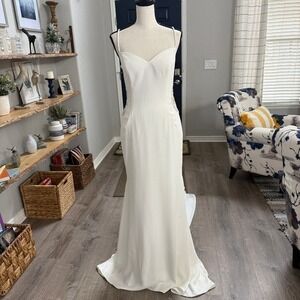 Stunning Justin Alexander designer wedding gown, brand new with tags. This elegant sheath silhouette features a clean ivory crepe body, a breathtaking illusion-lace low back, delicate spaghetti straps, and a subtle sweep train.