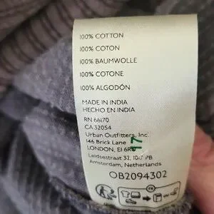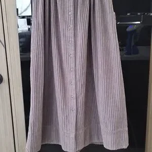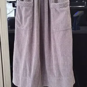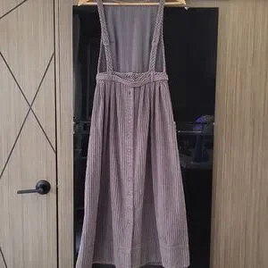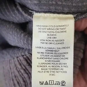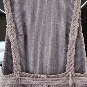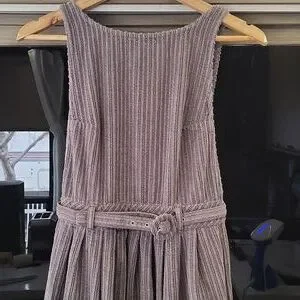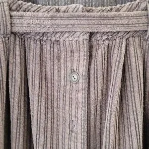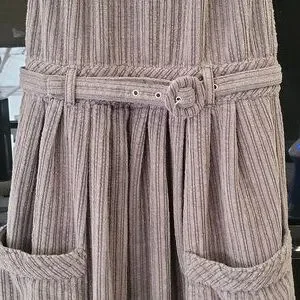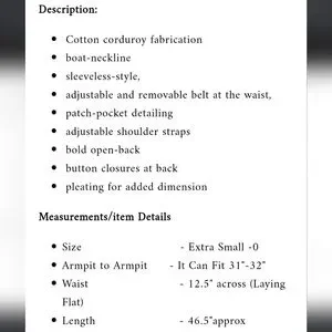 3.) Description;, in great pre- loved condition) doesnt appear to have been worn much), no stains or holes, ( upon inspection there is one round metal button missing on the back) ( as seen in pics) Can be fixed easily) (everything else is great!) 100% cotton, very soft to the touch, courderoy, adjustable bib straps with metal buttons on the back srraps, high neckline,gray, pleating, adjustable front belt, button up on the back with metal buttons, has two front latge pockets with a 8in. opening and the depth is a little over 7in. deep) nice size front pockets. Made well!