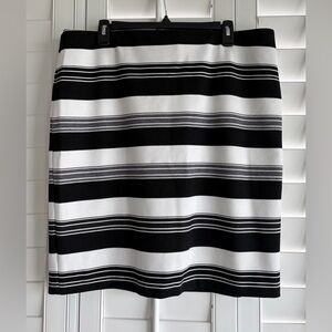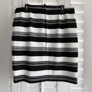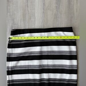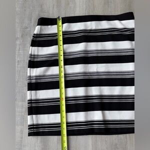 Perfect condition! Stretch knit (75% polyester/20% rayon/5% spandex) black and white striped skirt is comfortable. Pair it with your favorite top for work, date night, or a night with friends. See pictures for measurements.