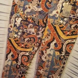 Vibrant paisley print pants with a mix of colors. Perfect for a bold fashion statement.