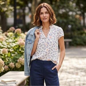 The design is elevated by a delicate, ruffled collar and a classic button-up placket, offering a polished yet relaxed silhouette. Its subtle cap sleeves and curved hem make it an ideal piece for pairing with your favorite trousers or jeans for a look that is both fun and timeless. Ideal for spring, summer, Easter, travel, church, etc.