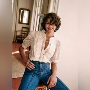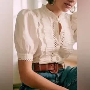 The Waves Shirt embodies Sézane’s signature romantic Parisian aesthetic, crafted in lightweight cotton with delicate vintage-inspired detailing. The design features scalloped embroidered panels that create a soft “wave” motif along the front, paired with airy openwork lace inserts for subtle texture and breathability.