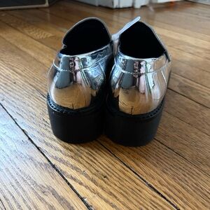 Step out in style with these sleek silver loafers. Featuring a glossy finish and a sturdy black sole, these shoes offer both elegance and comfort.
