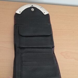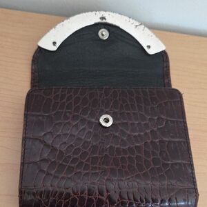 Chic soft leather wallet with crocodile texture. Features ornate silver accent. Ideal for stylish organization.