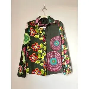 Desigual Women's Large Floral Artsy Button Down Blouse Multi Colored Embroidered