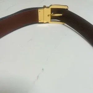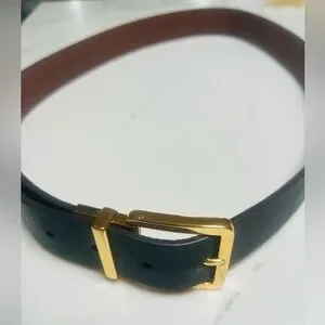 Gorgeous leather belt with reversible gold closure. Inside side is brown and the other black. Excellent condition. Best for 34-38”.