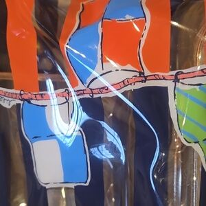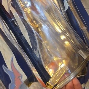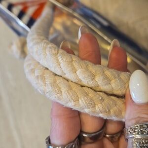 Such a perfect beach bag! Sturdy rope straps. Inside zipper pocket. Spacious! Measures approximately 20" x 13". In great condition except for a few small scuff marks on vinyl...see pics.