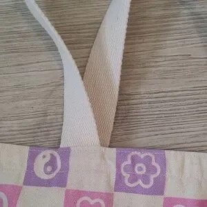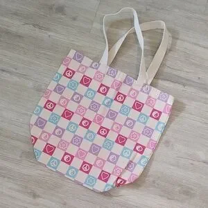 Show your personality with this playful shoulder satchel made of washable fabric with a pattern of peace signs, hearts with yin and yang. Perfect for carrying your essentials with whimsical style. 18" x 20" with 8.5" bottom width. New. Never used.