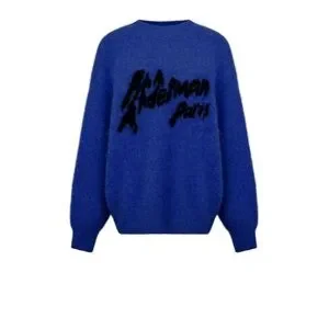 Stay cozy and stylish with this blue sweater featuring bold black text. Perfect for any casual outing. Oversized. New
