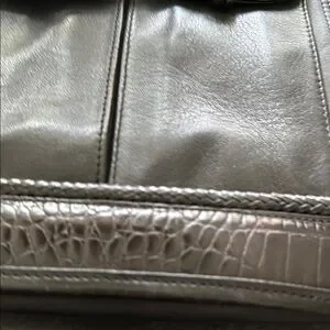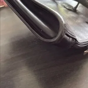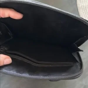 Sophisticated black slim handbag with croc-embossed accents. Features dual front pockets and sturdy handles. Ideal for everyday use.