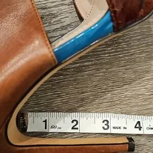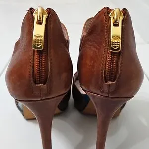 Dark reddish brown cork over rounded almond peep toes. Features a unique turquoise blue color contrast at the toes and peeks out along the sides too.