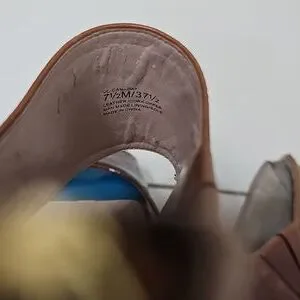 The main leather area around the ankle, where it's a lighter medium brown color, is "distressed-looking" leather--but I can apply leather conditioner to it if you'd rather it not have that distressed look [I kind of like it & left it for you to have the option (they aren't scratched up)]. Please note that exterior is genuine leather & inside is vegan and starting to shed. Back zipper pull is gold hardware