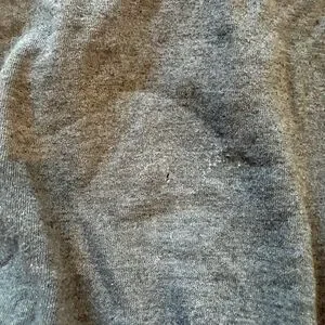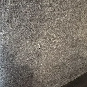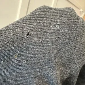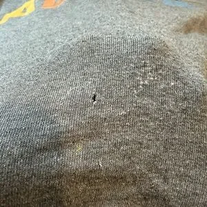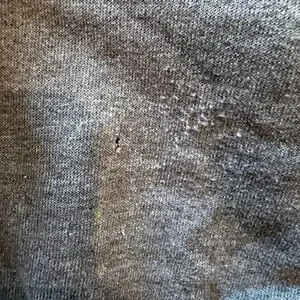 Only flaw is a very small stain on the lower back. I tried to clean it and ended up creating a tiny hole and slightly over-distressing that same area from brushing too hard (shown in photos). The hoodie was originally designed with a distressed look, including factory-made holes, so the small hole blends in with the overall style and isn’t very noticeable.