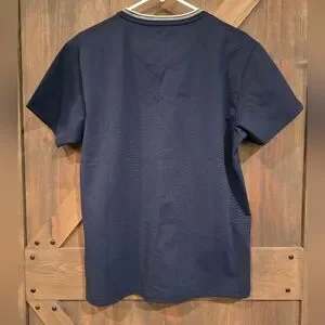 Stylish dark blue & sand V-neck tee. Comfortable and versatile for any occasion. Durable fabric!