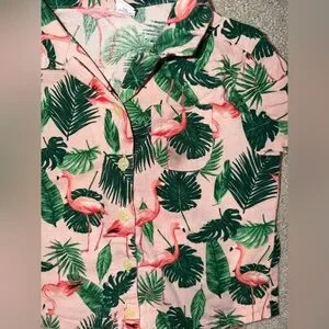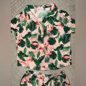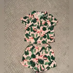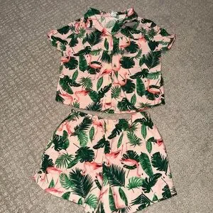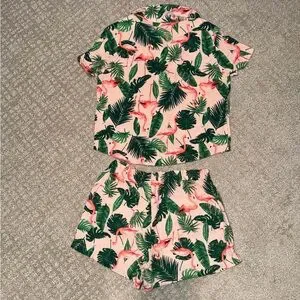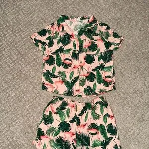Charming set with flamingo and leaf print. Soft fabric for comfort.
