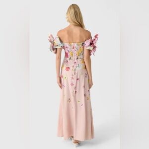 Chic strapless dress with vibrant floral accents. Perfect for elegant occasions.