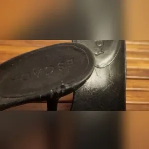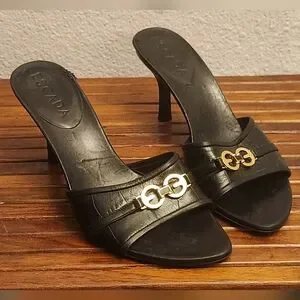 Elegant black leather heels. Features gold accent detail. Perfect for any occasion.