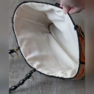 Incredible Columbia Minerva needlepoint "Ecology" tote bag, crafted from a 1970s kit by Bob Miller. It features a colorful patchwork design of various nature motifs, including a ladybug, cherries, mushrooms, flowers, and a bee, on plastic canvas with black beaded handles. Very rare find!