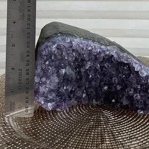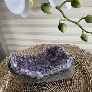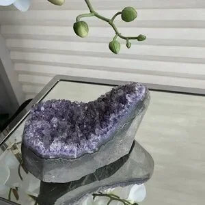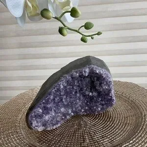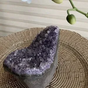This exceptional specimen showcases a deep, velvety purple hue—a hallmark of high-grade amethyst (Grade A to AAA quality). Its rich saturation and natural color depth make it an eye-catching focal point in any room. The interior features densely packed, well-formed druzy crystals that shimmer brilliantly under light, creating a captivating sparkle from every angle.