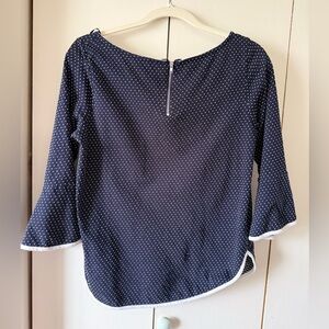 Chic navy blouse with white polka dots. Features stylish white trim and flared sleeves.
