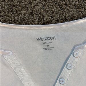 Elegant white long sleeve tee. Features a buttoned neckline. Ideal for casual wear.