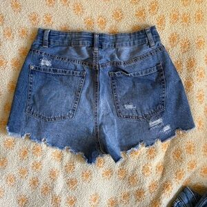 Stylish distressed denim shorts. Features frayed hems and classic five-pocket design. Perfect for casual wear. Please look at pictures for size and brand.