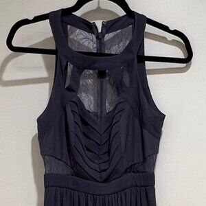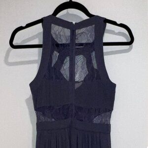 Powder blue chiffon maxi dress. It has two side slits. VERY light weight and comfortable. Zipper up the back. Lace panels on sides and covering the back. fitted to the mid section and then flowy. I am 5'3 and wore heels and it just brushes the ground. Good condition but worn twice.