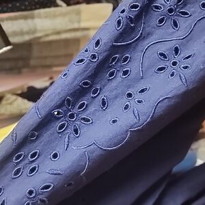 Navy blue button front top, embroidered lace arms