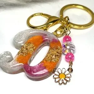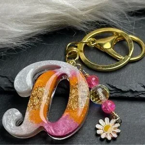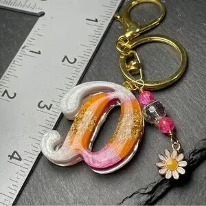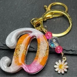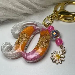 Add a touch of Colorful ice cream inspired elegance to your accessories with this Orange cream and pink Initial Letter “D” keychain. Featuring a gold foil inlay and charming enamel daisy charm, it's perfect for adding a pop of color to your keys or bag.