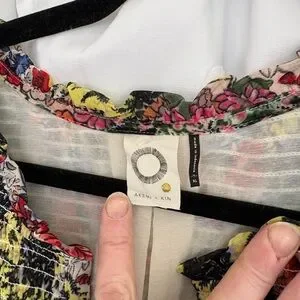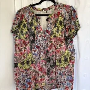 Perfect for spring and summer! Soft and stretchy anthropologie blouse in the Akemo Kin line. Fully lined with an off-white layer. Ruching on the bodice makes for a great fit for many body shapes.