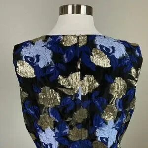 Badgley Mischka dress, floral brocade dress, A-line cocktail dress, metallic dress with pockets, designer blue gold dress, Platinum label dress, size 12