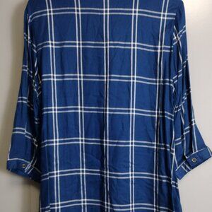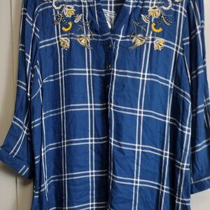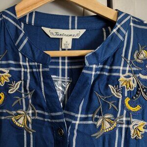 Tantrums women’s size Medium blue windowpane plaid blouse featuring beautiful embroidered floral detailing along the neckline.