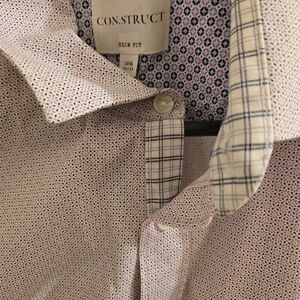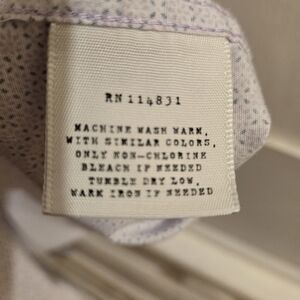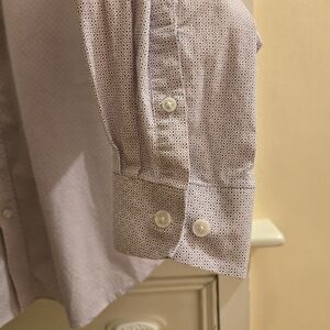 This mens stretch dress shirt is 97% cotton and 3% spandex. It has a micro print of purple and gray. The collar, inner cuffs and the inner button strip are lined with plaid fabric and the upper back is lined with a third fabric of varying purple dots. The neck measures 16.5" and the sleeves are 34/35". The shirt is a slim fit.