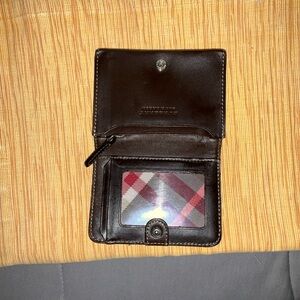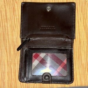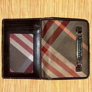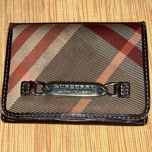 Stylish Burberry card holder with striped design. Features black and red hues. Sleek and compact. this has two interior pockets with a center zip point pocket and two ID holders one on the inside one on the outside. It’s an older wallet so there is some slight wear and discoloration( need to look closely on the material. It is older so I’m asking that you manage your expectations. It is not new tags.