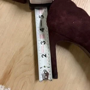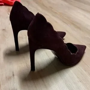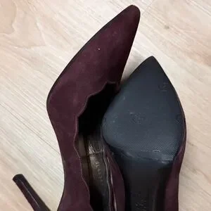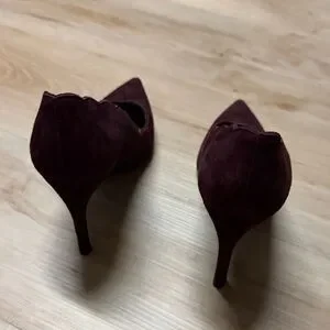 Elegant burgundy heels with scalloped edges. Suede finish. Pointed toe design.
