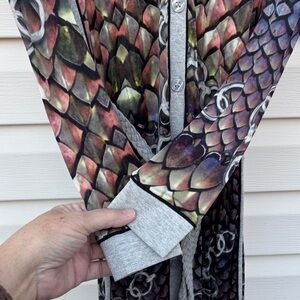 Eye-catching long sleeve top with a scaled pattern. Features a blend of dark and light hues.