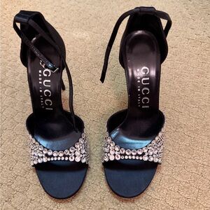 Chic Gucci heels featuring a sleek black design with striking silver crystal embellishments. Ideal for elevating any ensemble. Worn once, in great condition.