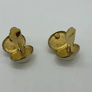 These vintage 1980s clip-on earrings feature a gold-tone finish and double faux pearl cabochons, offering a timeless and elegant retro aesthetic.