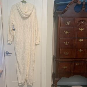 Stay warm and comfortable in this cozy cream hooded pajama onesie. Perfect for lounging and relaxing.
