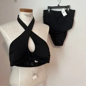 Elegant black bikini set with halter neck. Features keyhole design. Bottoms are high waisted and very flattering. Both are new with tags.