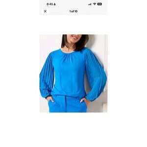 Talbots Women's Petite Lg Pleated-Sleeve Crewneck Shirt Top/Blouse Blue NWT