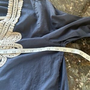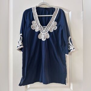 Gorgeous cotton tunic. Embellished along v neckline and 2/3 sleeves. Split hem. Wear as tunic or swim cover. Has been worn. In excellent condition. See pics for measurements