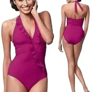 Spanx Ruffled Swimsuit One Piece Halter Faux Wrap Magenta Pink Small