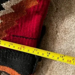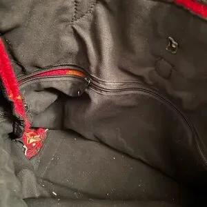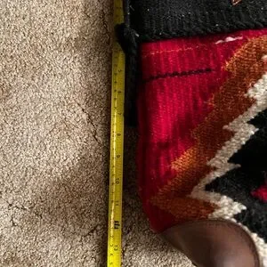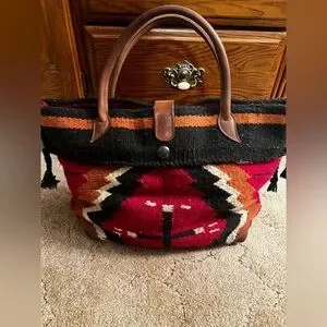 Elevate your style with this artisan tote featuring a striking red and black geometric pattern. Perfect for adding a bold touch to any outfit.