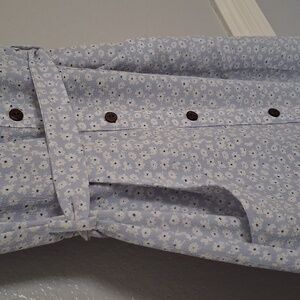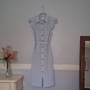 Charming light blue dress with floral pattern. Features button-down front and ruffled sleeves. Ideal for casual outings. And it has pockets!!