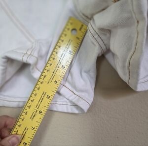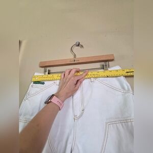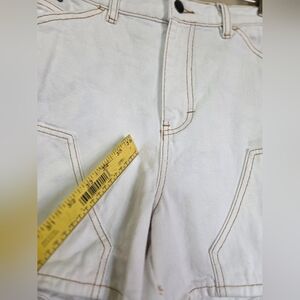 empyre white denim jeans shorts in Dixie style. cargo, stretchy back on the waist band. in very good used condition, some minor discoloration from color transfer and a small spot that's hard to see and may be sun treatable.