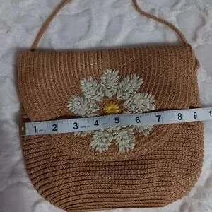 Elevate your style with this chic tan woven shoulder bag, featuring a beautiful floral design. Ideal for any casual outing.