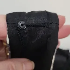 Features include: interesting neckline with a V, side pleated panels the give the appearance of cinched waist, bra strap holders, dress had some stretch to it.