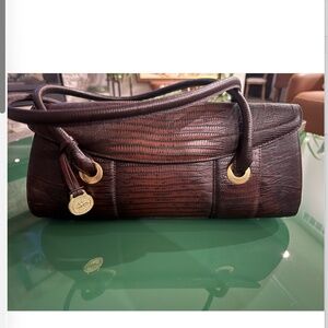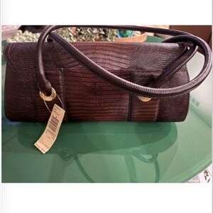 • Alligator Embossed Genuine Leather with Gold Toned Brass Hardware.